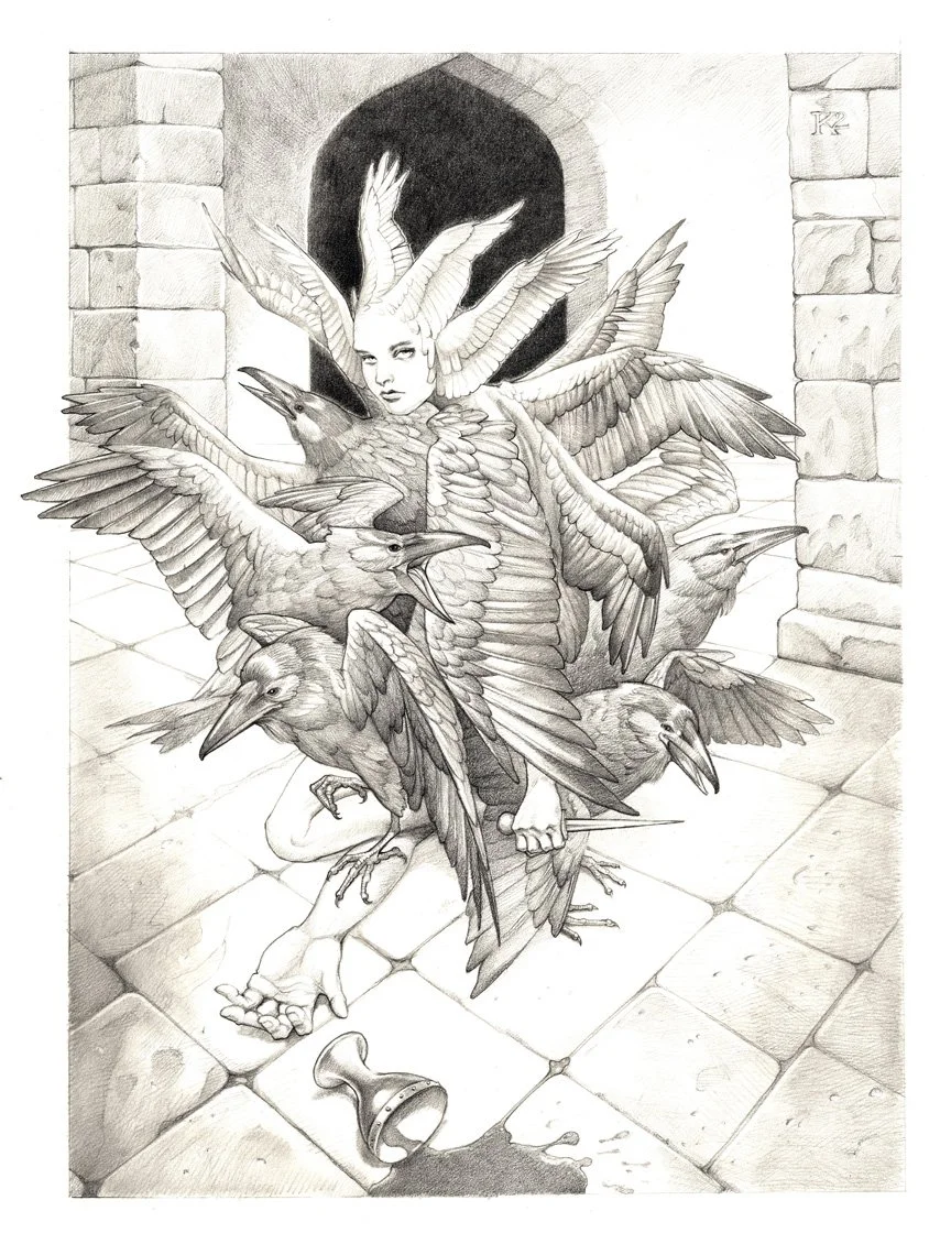 I’ve written before about my affectionately dubbed “revenge series” (in GALLERY), a group of paintings and drawings in which I’ve envisioned creatures as an aggregate— multiples. This idea started to form sometime in 2010 when I was thinking about how individuals in a flock, swarm, or school, can synchronize and move together as one, appearing as a single unit or entity. Intrigued, I began thinking how this idea might appear in a fantasy work of art, a genre known better for its individual human warriors fighting lone battles against a horde (eg. Frank Frazetta’s “berserker” series). What if I flipped the script and created an entity comprised of multiples? What might she accomplish?