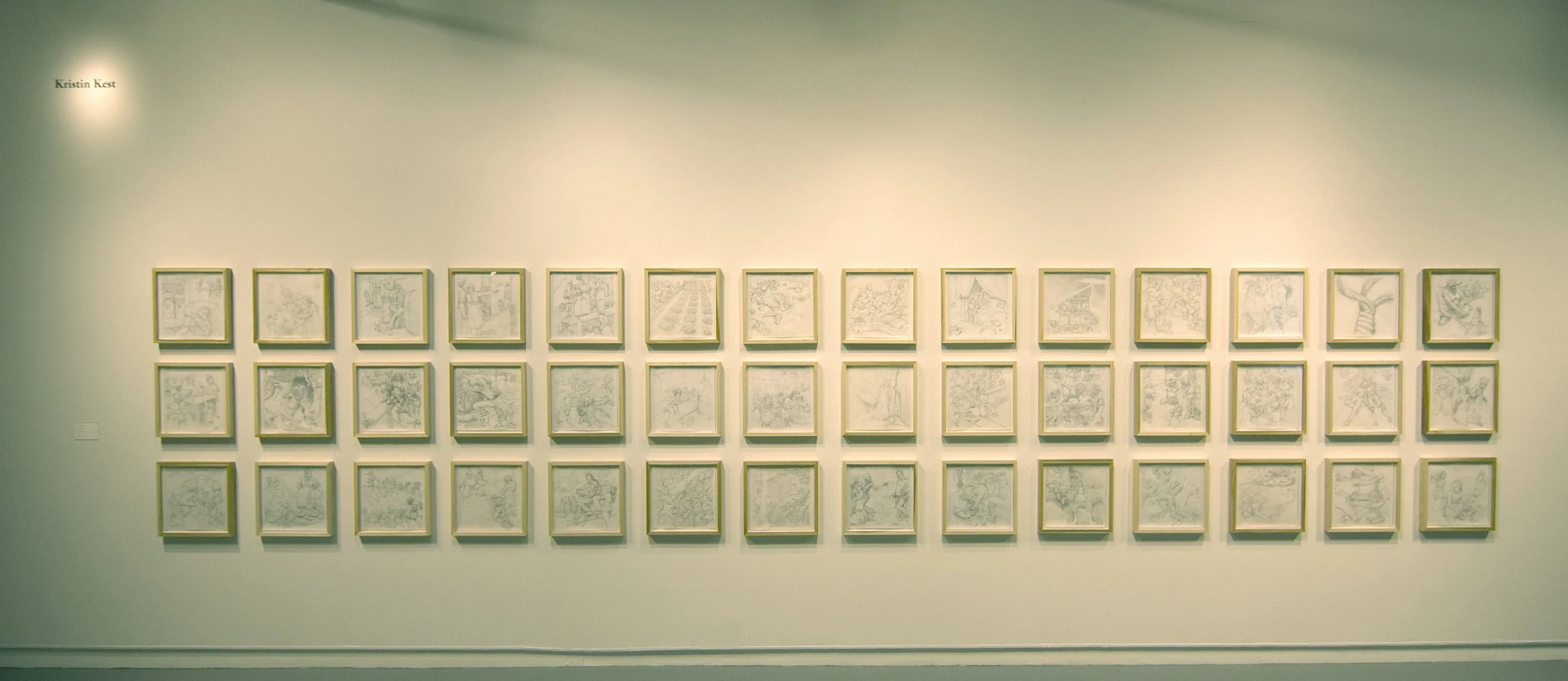 The installation of “Fables” my MFA thesis work at MICA, 2010. The character, Red, is seen moving through many of the panels, meeting various activators of her non-linear story, gaining skills and powers along the way.
