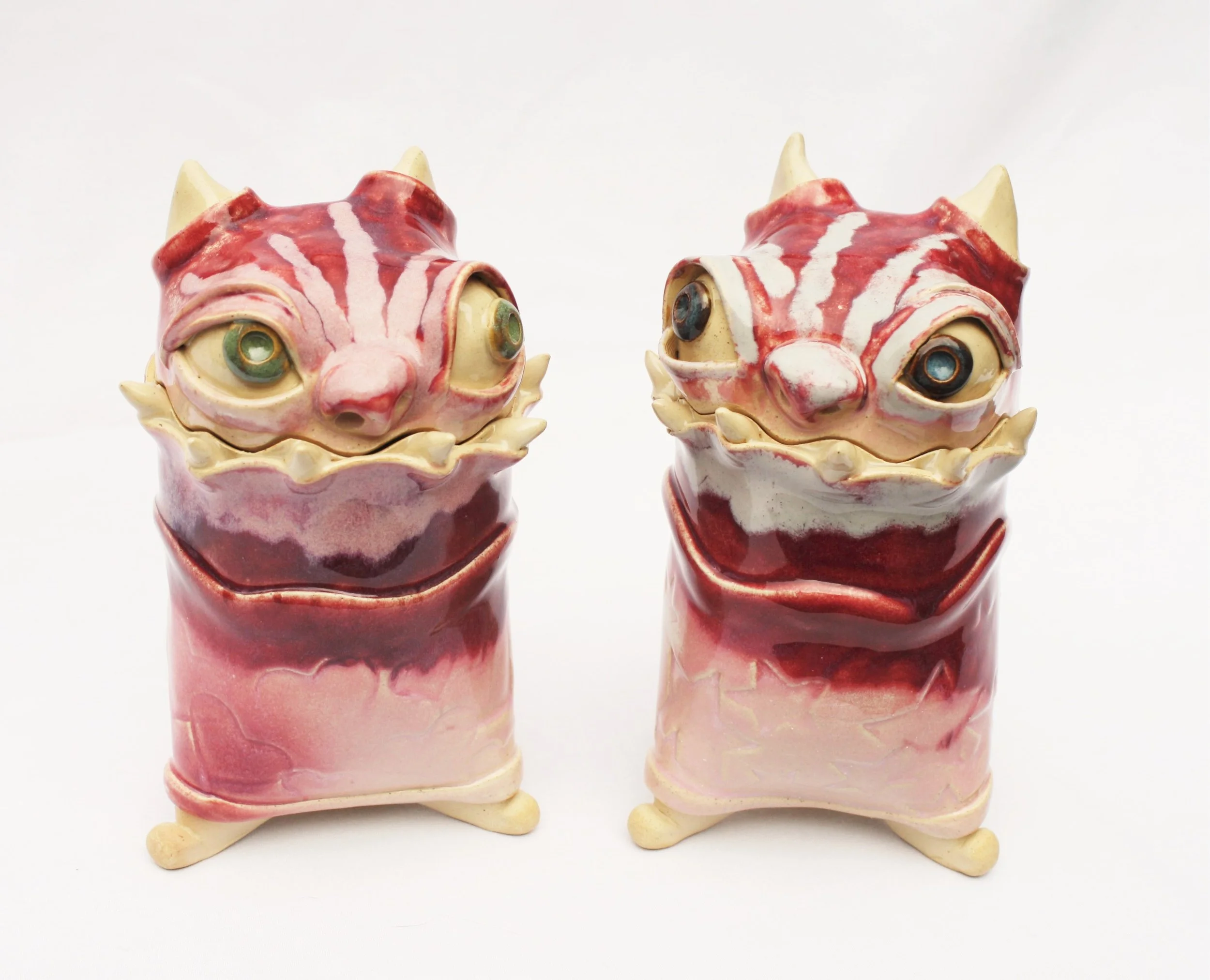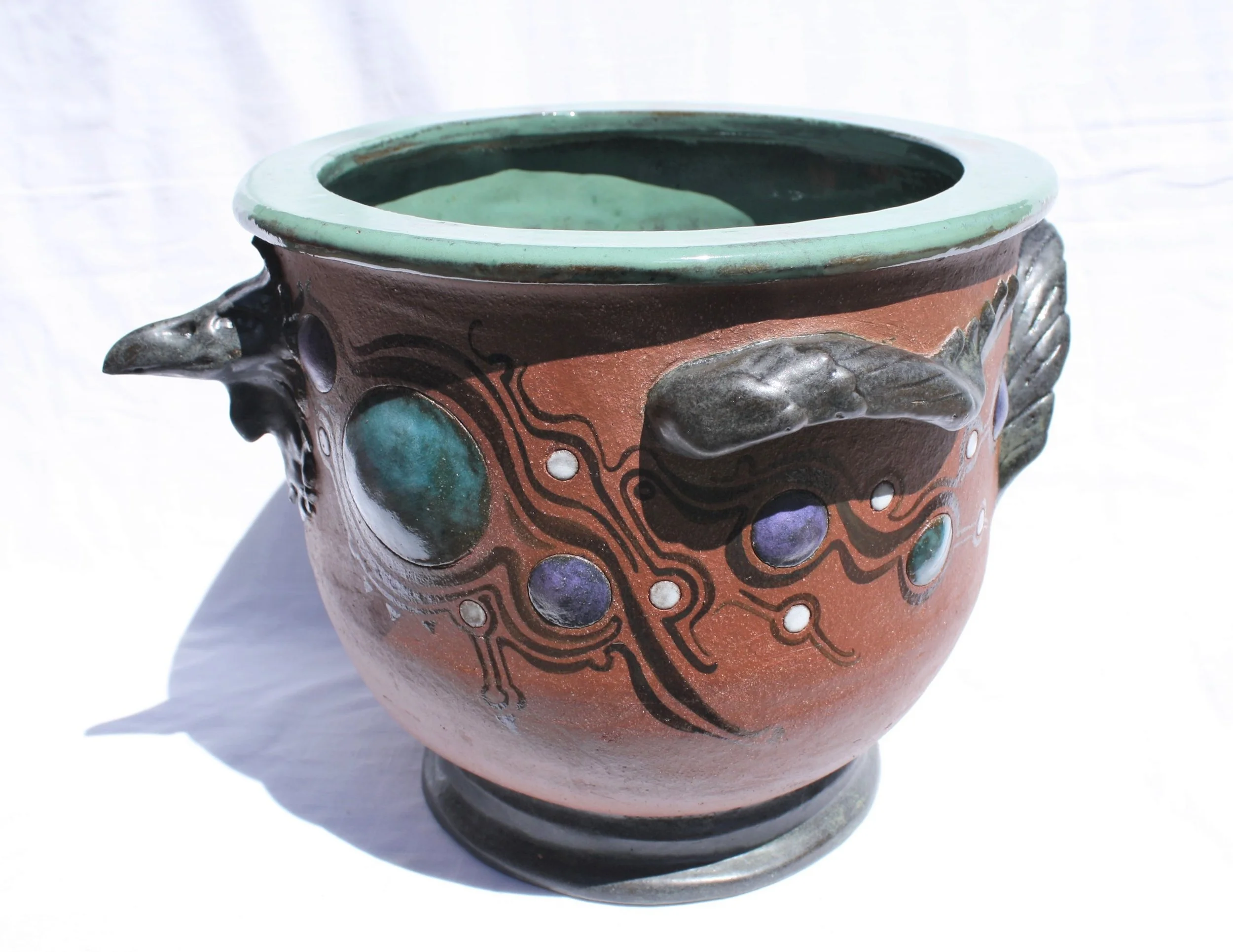 2020. Buff stoneware with chromium-tin glaze. A friend commissioned sibling monsterpots for his two daughters. I’ve made many special monsterpots! Here’s an article about them.