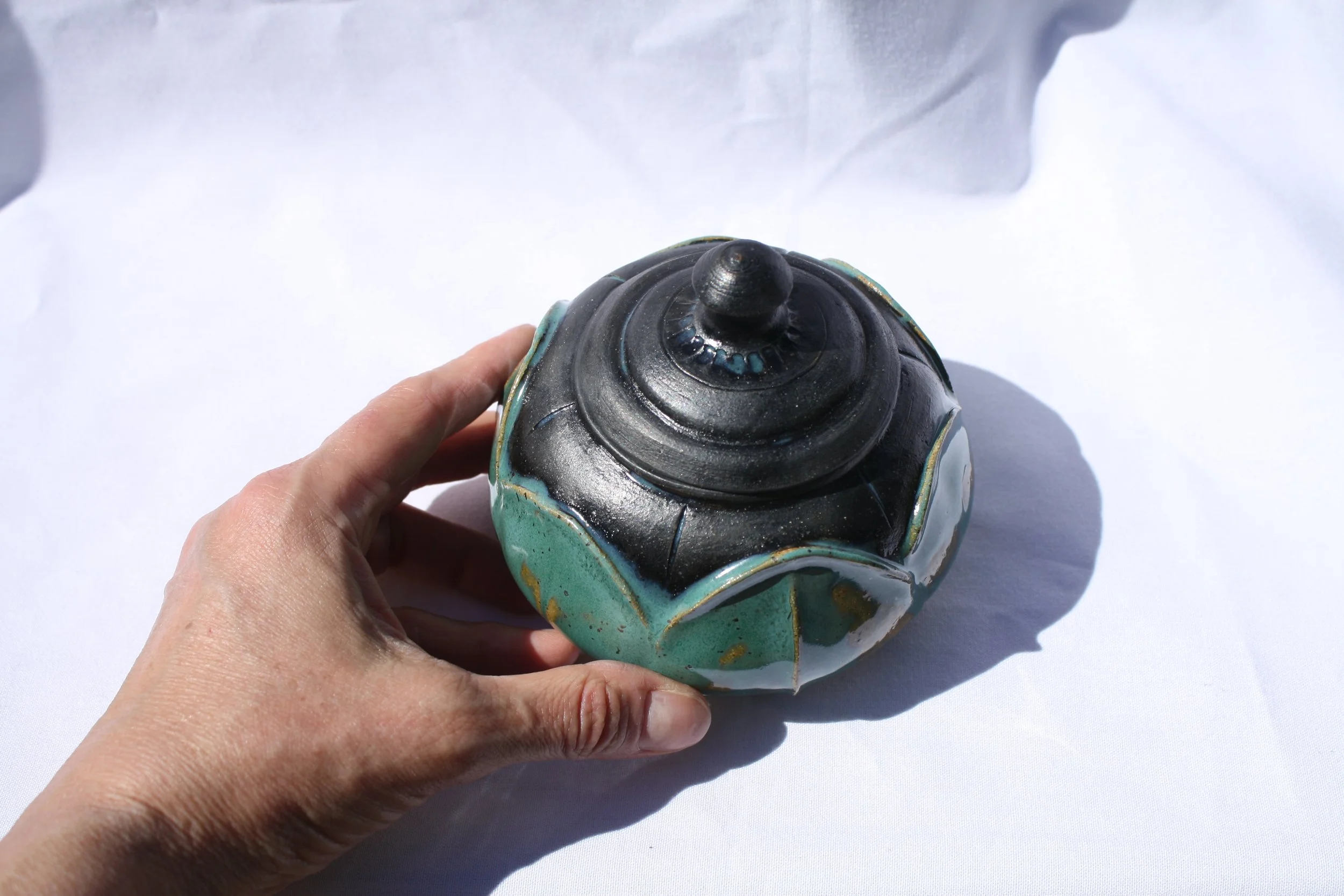 A dear friend’s family gifted their mom a moonpot whose daughter had died unexpectedly. The glaze is very special; it’s made with Laurie’s ashes. Read more here about how these are made with a paddle + compass.