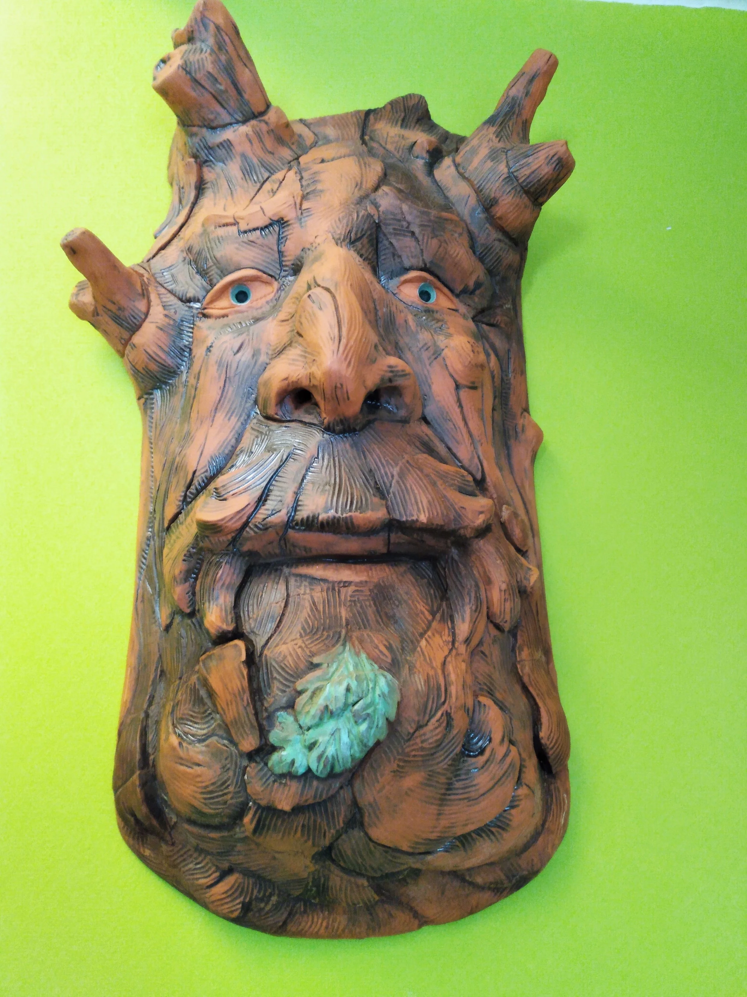 14”h; terra cotta redware with copper oxide washes. A client, whose dad had passed on, wanted to honor his memory by having his visage sculpted in the form of a Forest Spirit.