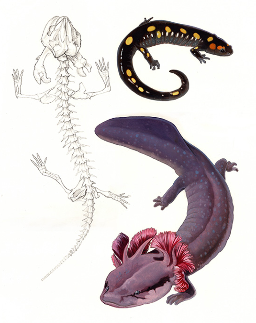 Animal Skeletons book interior spread of a colorful axolotl and an amphibian skeleton.