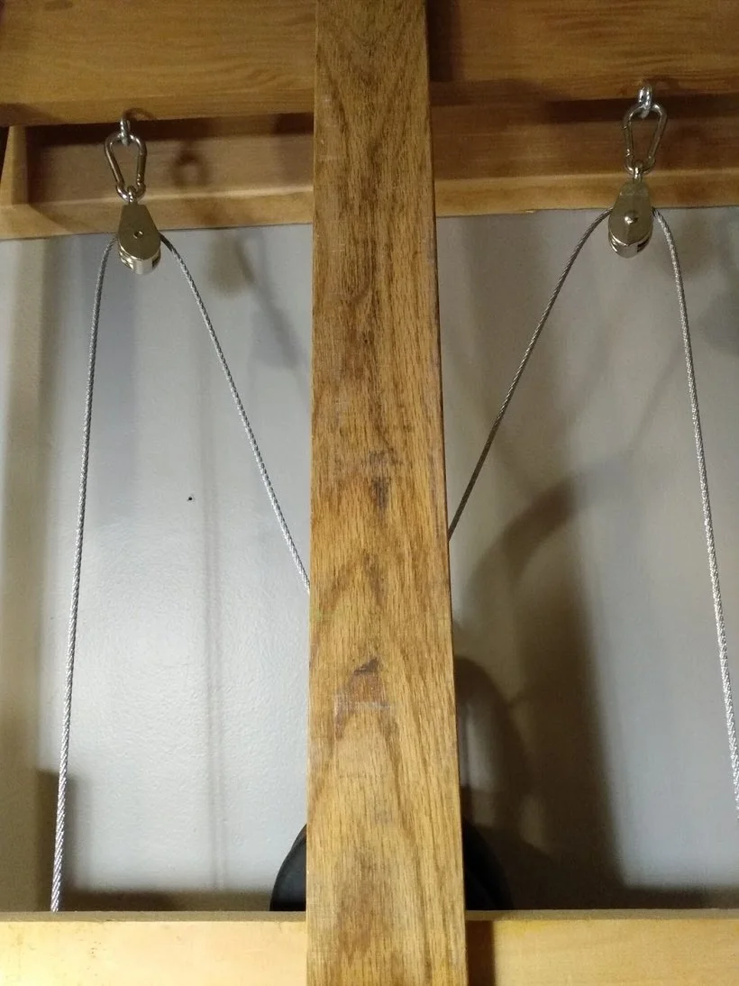 Then I saw another design (an Italian company) which seemed to offer the most elegant solution: a counterweight. No winches or drives needed. It was comprised of a simple pulley system with a counterweight system behind the easel mast. The weights could be added or subtracted as needed to balance the weight of the artwork which could be raised or lowered with ease. My spring lock wouldn't have to do much except anchor it in place; the weights would do all the heavy lifting. The Italian easel with tubular steel and a gorgeous design was very expensive ($12K!), but I realized I could utilize the same idea for far less money.