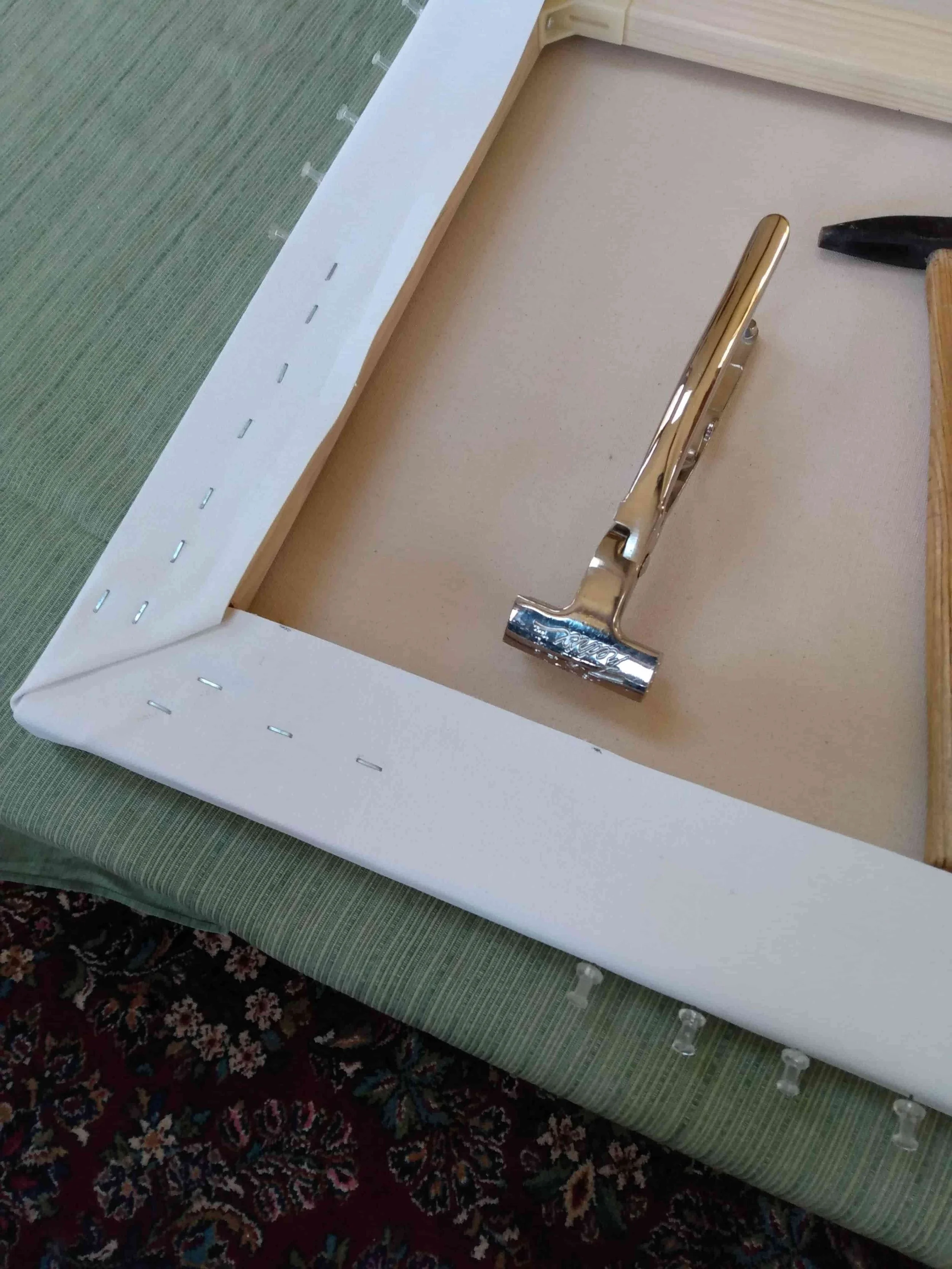 You’ll need a canvas and appropriately-sized stretcher strips, a heavy-duty stapler, canvas pliers, a tack hammer, and long thumbtacks.