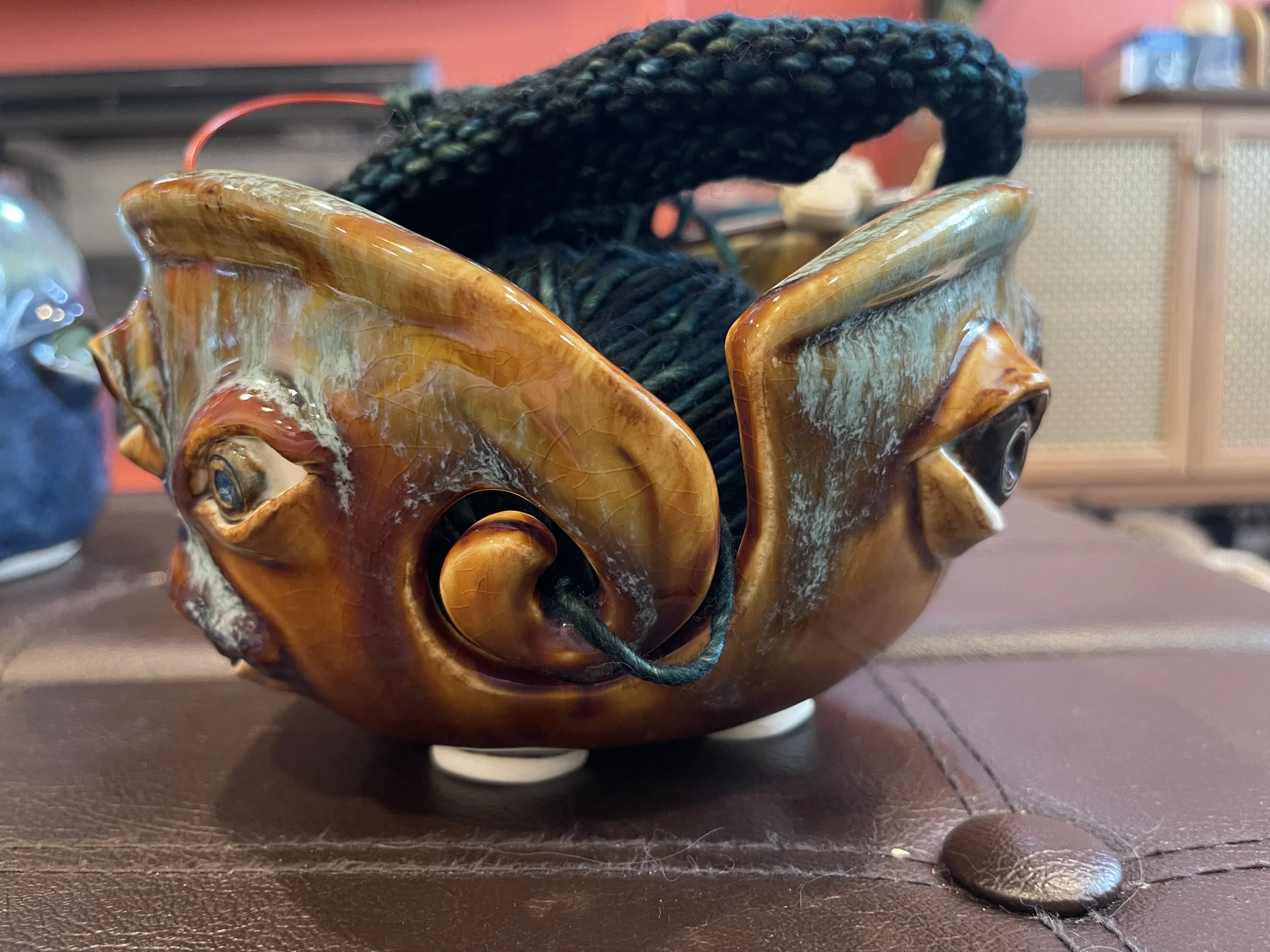 I had never made a yarn bowl before, but when a fan asked me to create some, I was eager to try. She provided dimensions and details for the “fishhook” to help me start. I made a prototype (the blue one) to figure things out, then created two more for her to choose from. During the process, I learned how yarn bowls should work, and I appreciated my client's patience as she explained things and waited for the bowls. I was very happy with the glazes and thrilled to send her all three, which she bought!