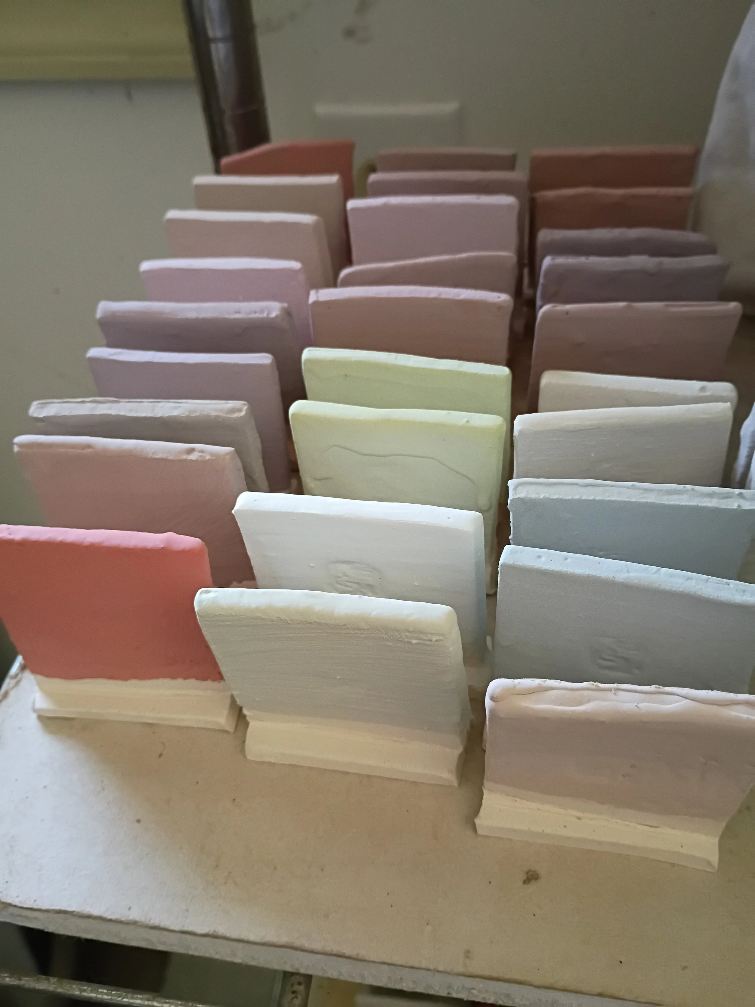 Test tiles ready to be fired. Raw glaze doesn’t look like much because it’s just powdered rock— until the heat of the kiln can work its magic.