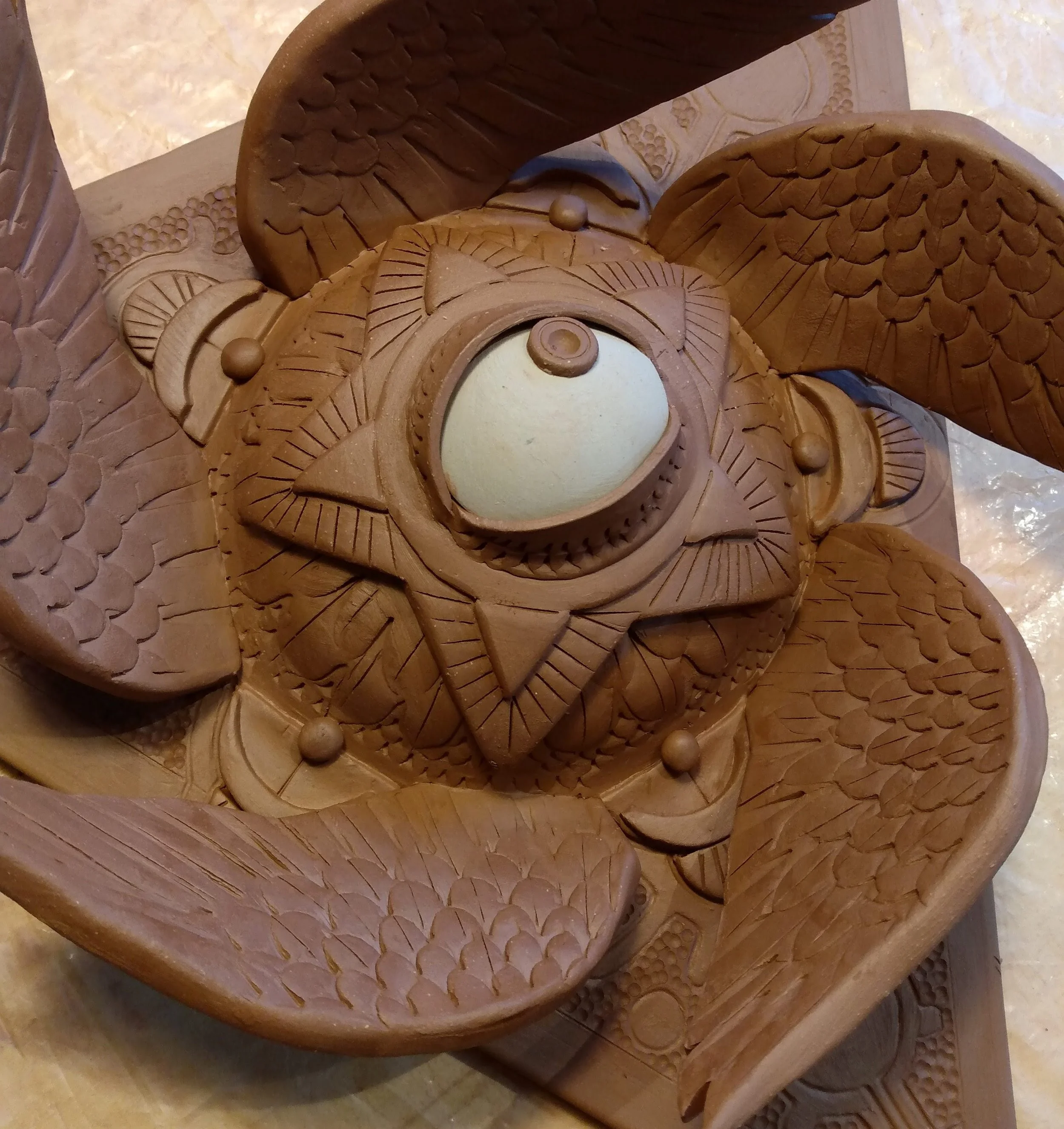 “The Emissary” is a hollow form made of white terra cotta which will receive underglaze washes before being final fired.