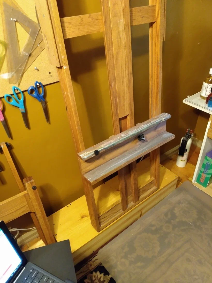 My oak easel, bought back in the early 90s when I was just starting out as an illustrator, while sturdy, was really only meant for lightweight canvas duty or for smaller boards. So, when I started working on heavier panels, I had a problem with the tray slipping…